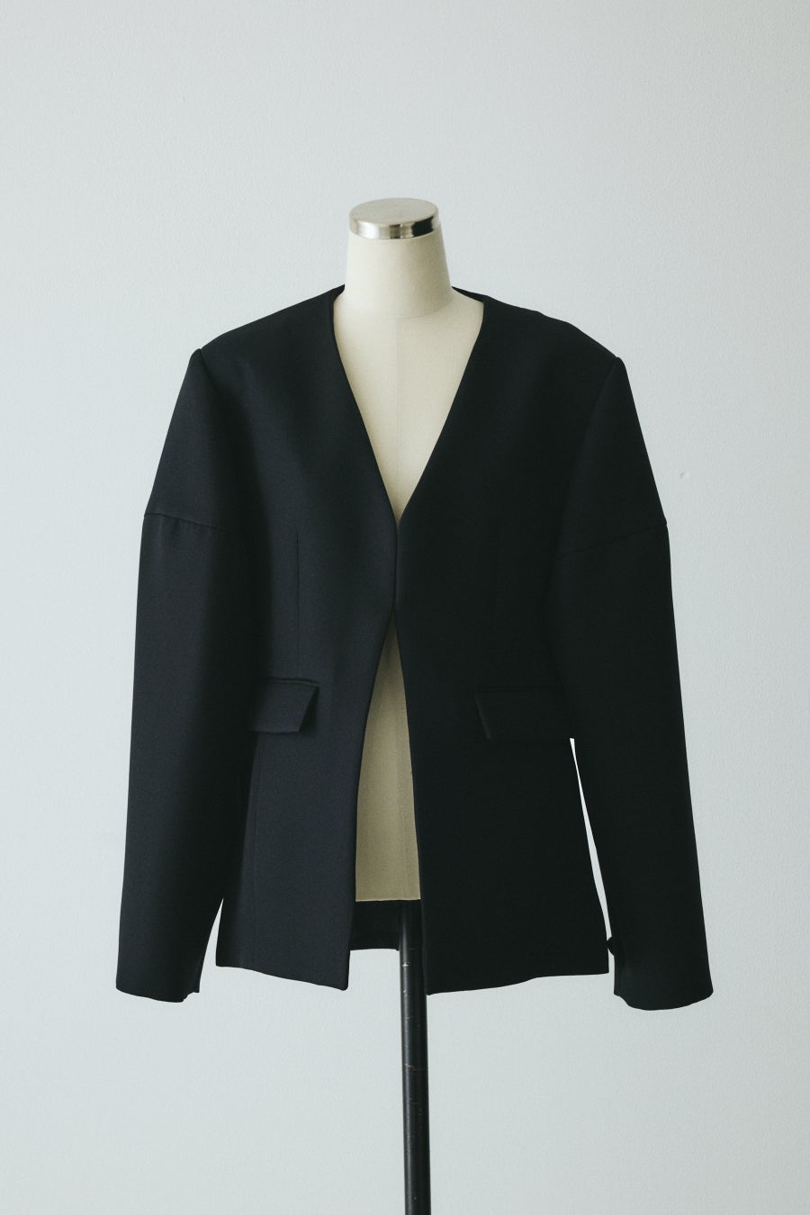 袖のバランスとボディーのバランスが絶妙なジャケット。肩周りはふくらみを出し、見頃部分はスッキリとした見え方になっています。前はホックで止められるようになっています。リサイクルポリエステルを使用したアムンゼン組織の三重織です。打ち込みのバランスにより、張り感や膨らみ感、軽さを兼ね備えた厚地素材。