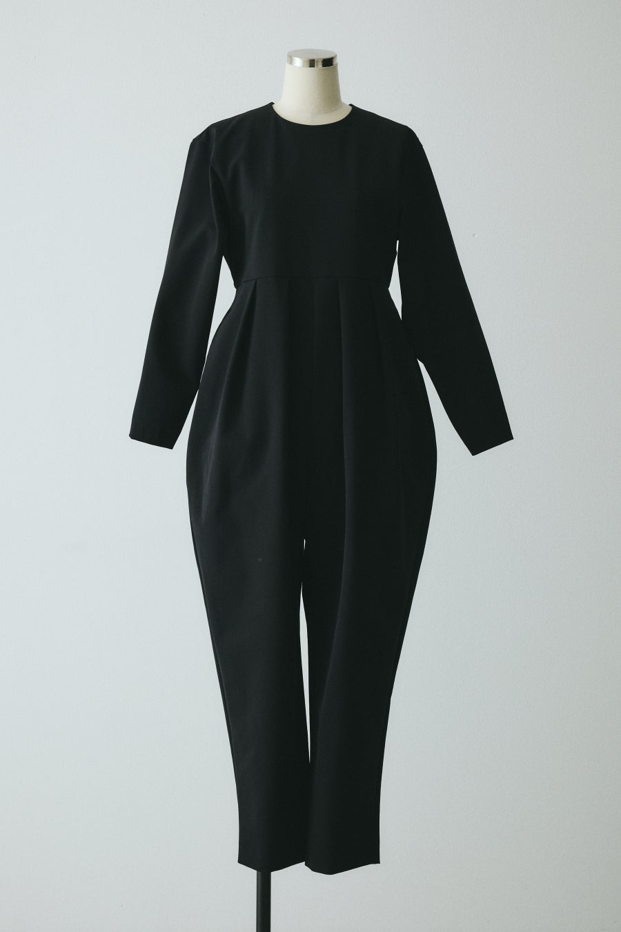 コクーンシルエットで立体的なオールインワン。モードな印象のオールインワンは凛とした一枚でマニッシュにも完成します。SOLOTEXを使用したダブルクロス素材です。撥水性とUVカットを付加した機能素材になります。