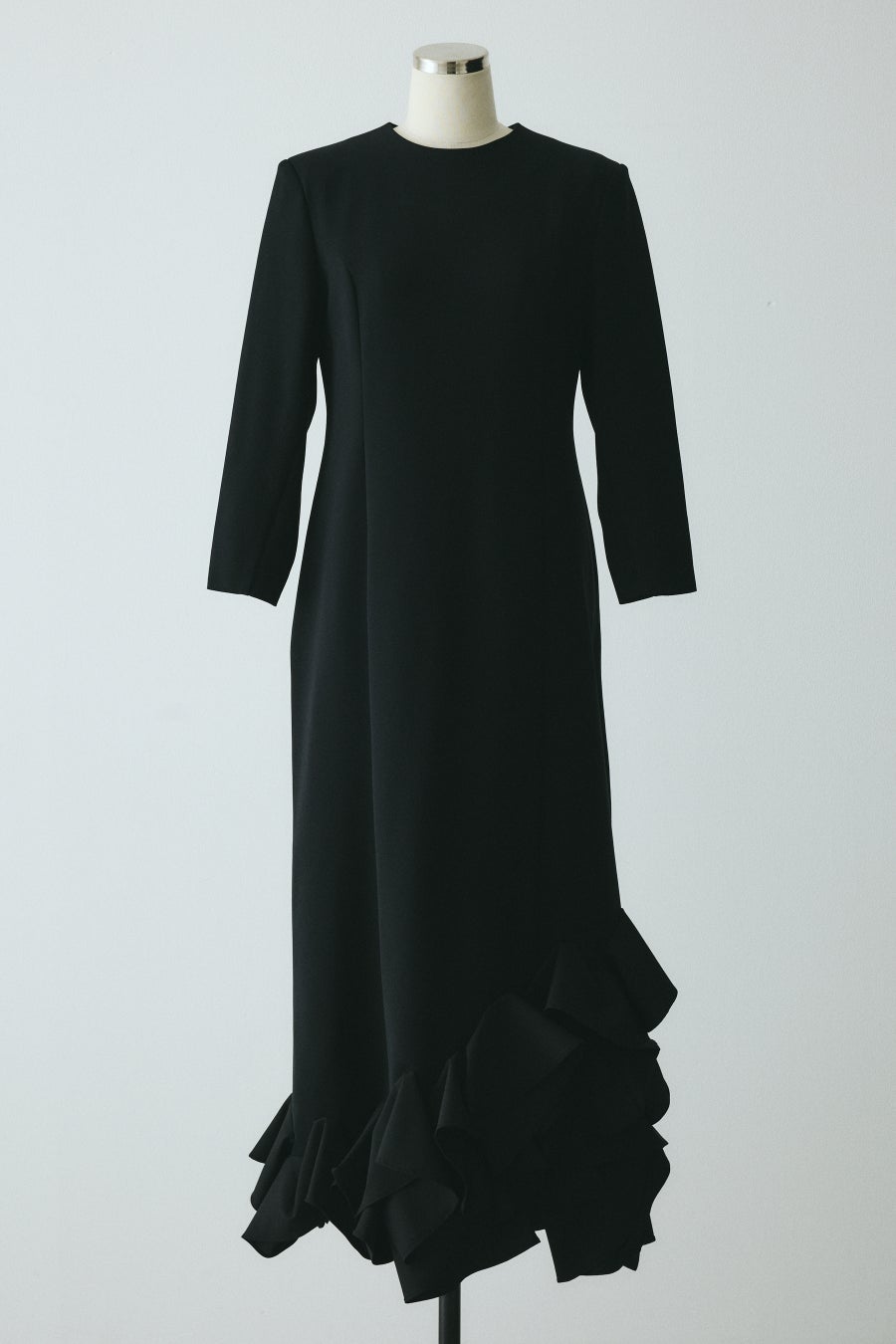 ミニマルなシルエットに裾の立体的なフリルをあしらったロングドレス。シンプルな華やかさを演出。日常から特別なシーンまで幅広く活躍します。フリル部分はハリ感・しなやかな風合いと、クリアな表面感と滑らかな肌触りが特徴です。