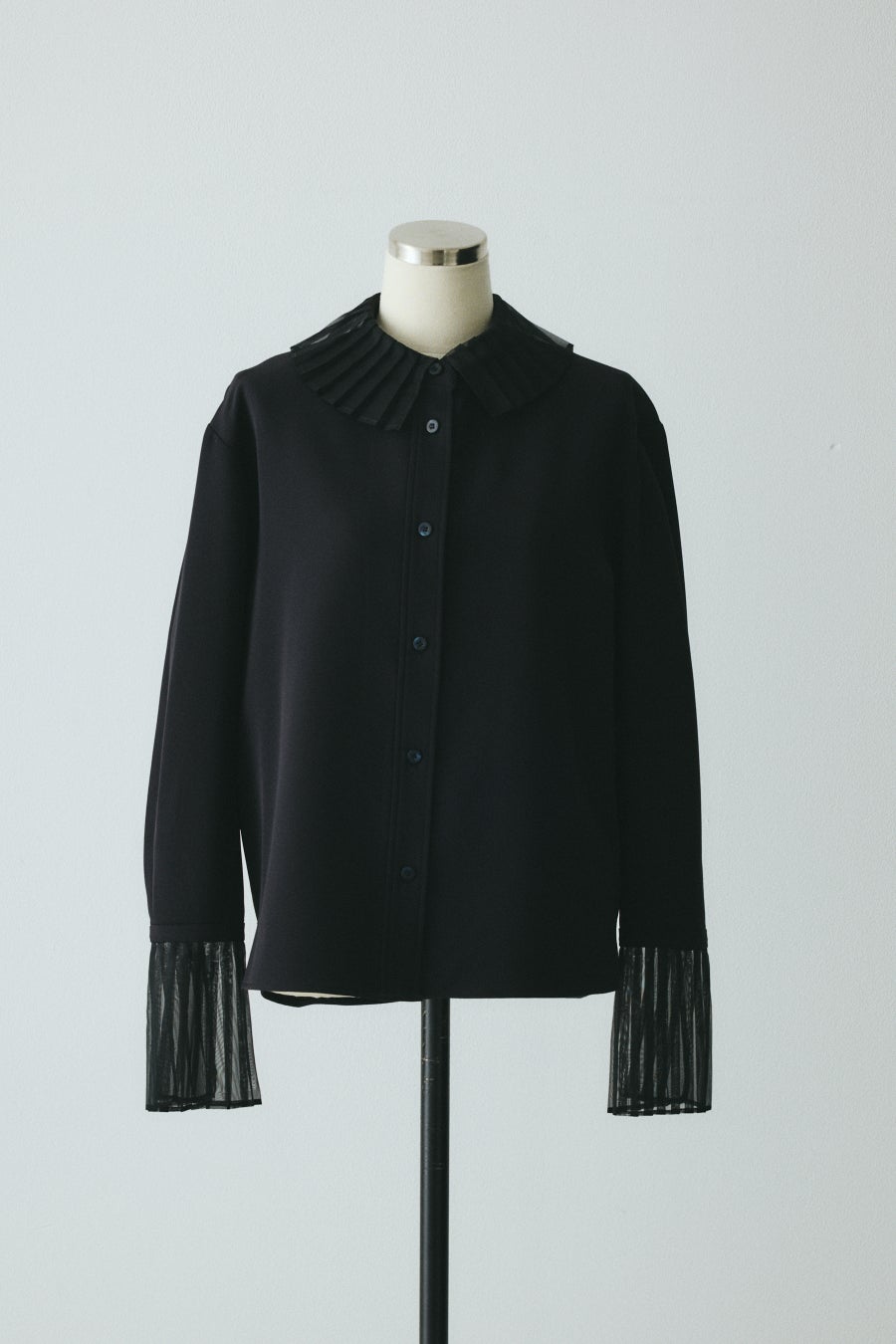透け感のある袖口と襟がポイントになるシャツ。見頃はしっかりとした布帛素材。一枚で綺麗に見せられて繊細かつ上品に仕上げました。レイヤードにも重宝します。ソフトに仕上げ、優しい表面感でストレッチ性もある二重織り素材。プリーツ部分はハリ感とマットな質感を併せ持ったオーガンジーとシフォンを掛け合わせたような素材。