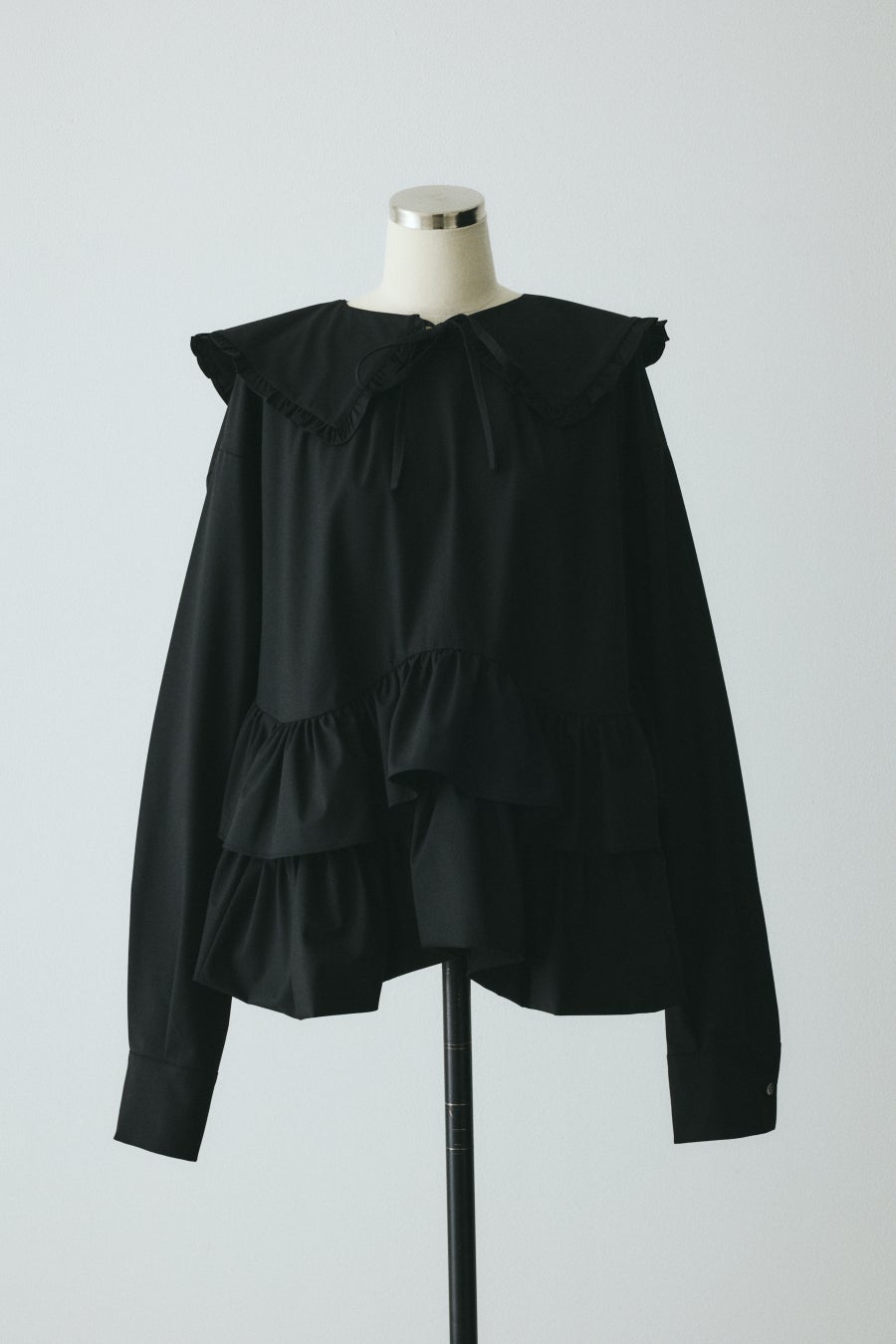 裾にあしらわれたボリュームのあるフリルが、シンプルなデザインに華やかさを添えるブラウス。ゆったりとしたシルエットが、体型をカバーしながらも女性らしいシルエットを演出。同素材の大きめな襟はリボンで着脱するタイプで単品でもお使いいただけます。襟を外せば詰まったクルーネックで、シーンに合わせてモードからフォーマルにと幅広く活用できます。適度にハリを感じるしなやかな風合いでキレイなシルエットが表現できる素材。毛羽の少ないクリアな表面感と心地よい滑らかな肌触りが特徴です。