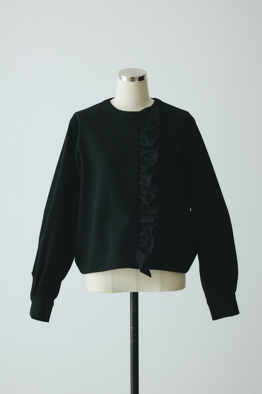さりげないフリルをあしらったトップス。細かいシルエットにまでこだわり、少し丸みのあるボディーに仕上げています。ふっくらとしたハリのある素材を使用することでしっかりとシルエットが出ています。伸縮性のあるポリエステル繊維を使用した、二重織2WAY素材。着心地の良いふくらみ感があり、フリル部分はハリコシのあるコットン薄手平織り素材。