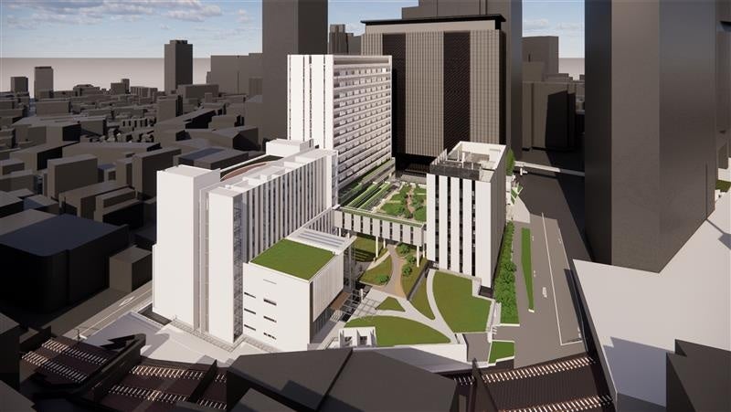 ・S造(鉄骨造)、延床面積 約30,000㎡、地上16階、地下2階、病床数401床