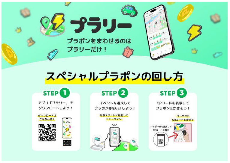 ジオフラが展開するおでかけエンタメアプリ「プラリー」を活用したデジタルスタンプラリーを実施します。期間中に、2つのミッション(A・B)のどちらかをクリアすることで、アプリ連動カプセルトイ「プラポン」を回すことができます。