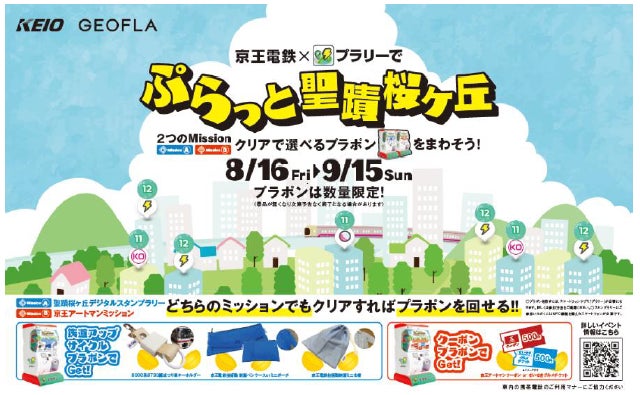 京王電鉄株式会社(本社:東京都多摩市、代表取締役社長:都村 智史、以下「京王電鉄」)は、ジオフラ株式会社(本社:東京都千代田区、代表取締役社長:尾崎 雄一、以下「ジオフラ」)が展開するおでかけエンタメアプリ「プラリー」を活用した聖蹟桜ヶ丘エリア周遊企画を8月16日(金)から9月15日(日)の期間限定で実施します。