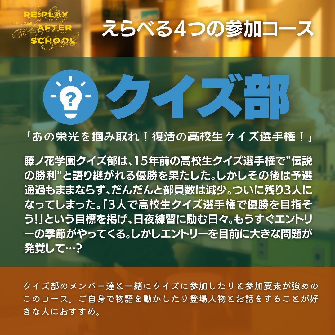 クイズ部のメンバーと一緒にクイズに参加したりと参加要素が強めのこのコース。ご自身で物語を動かしたり登場人物とお話をすることが好きな人におすすめ。