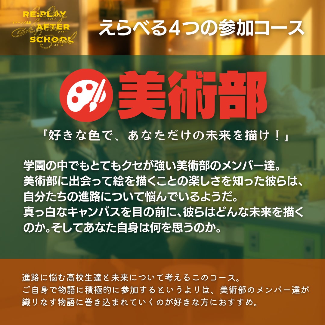 参加者はチケット購入時に選択することができる4つのコース(美術部・ロック部・生徒会・クイズ部)に分かれて放課後の部活動体験を行う。個性豊かな部員と先生たちの会話を聞いたり、時には話しかけられたりしながら、参加者は彼らの悩みを知ることになっていく。参加者との出会いを通して成長していく姿を見守りながら、きっと懐かしい「あの頃」を思い出す、体験型の演劇となっている。