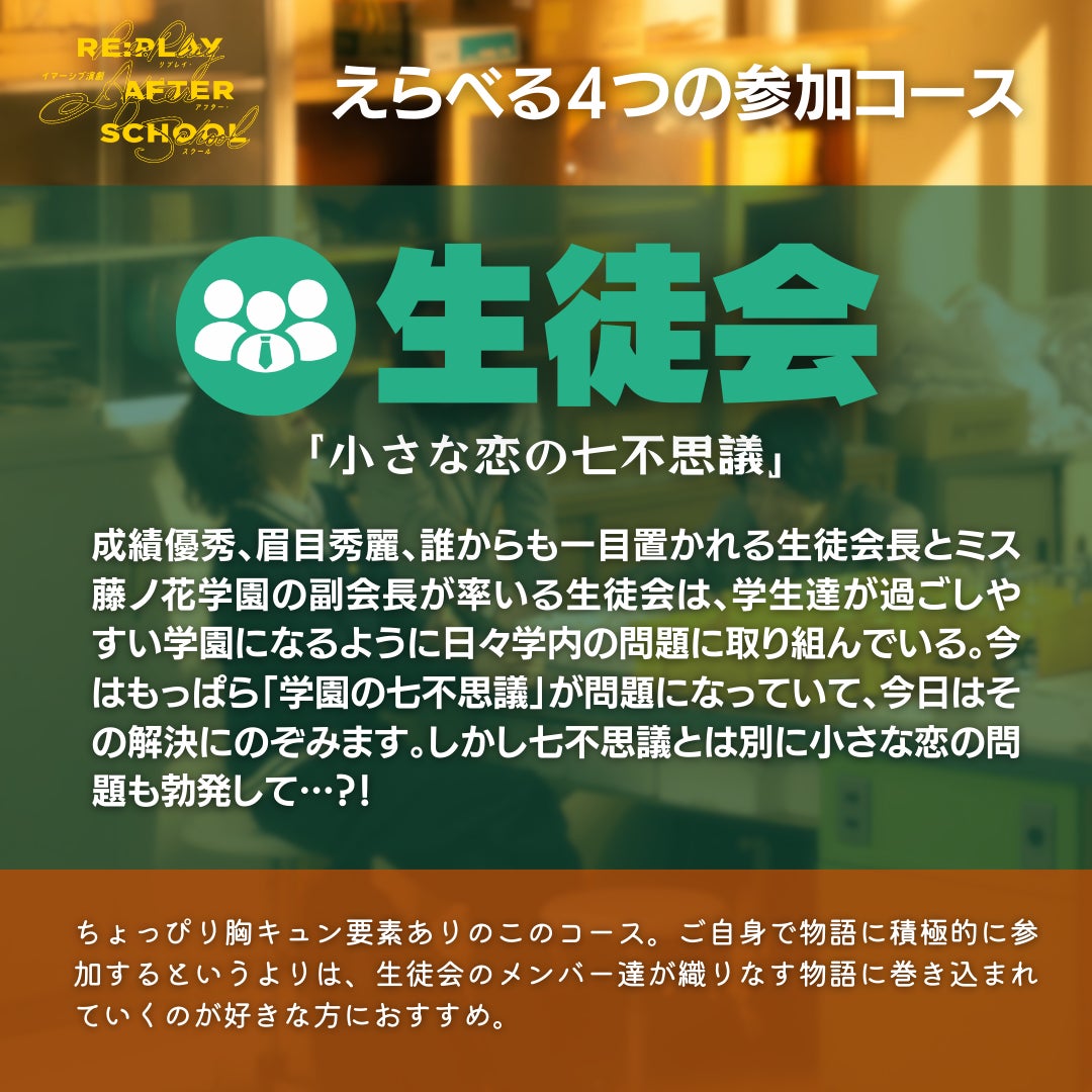 ちょっぴり胸キュン要素ありのこのコース。ご自身で物語に積極的に参加するというよりは、生徒会のメンバーたちが織りなす物語に巻き込まれていくのが好きな方におすすめ。