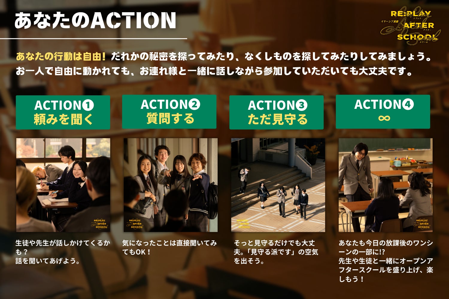 ACTION④∞:あなたも今日の放課後のワンシーンの一部に?!先生や生徒と一緒にオープンアフタースクール」を盛り上げ、楽しもう!