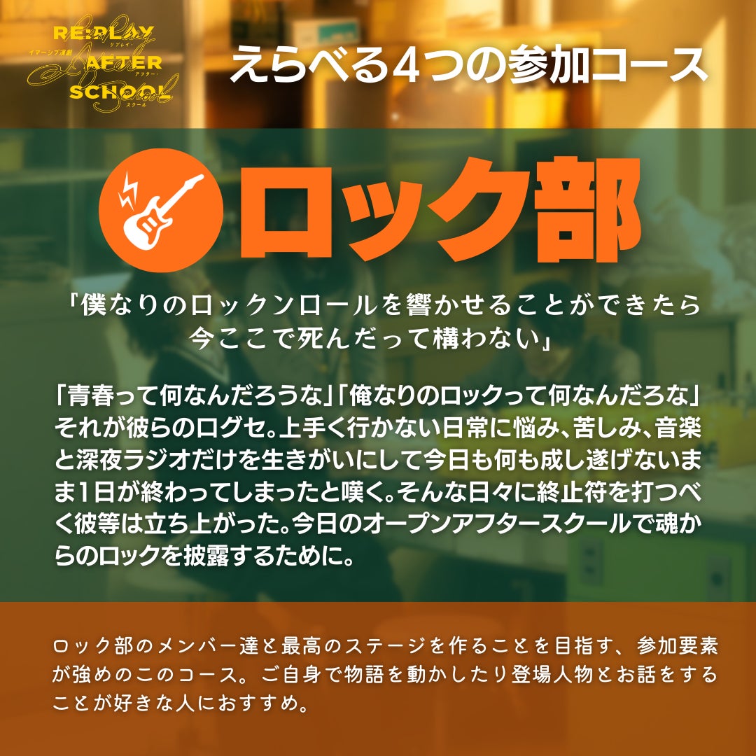 ロック部のメンバー達と最高のステージを作ることを目指す、参加要素が強めのこのコース。ご自身で物語を動かしたり登場人物とお話をすることが好きな人におすすめ。
