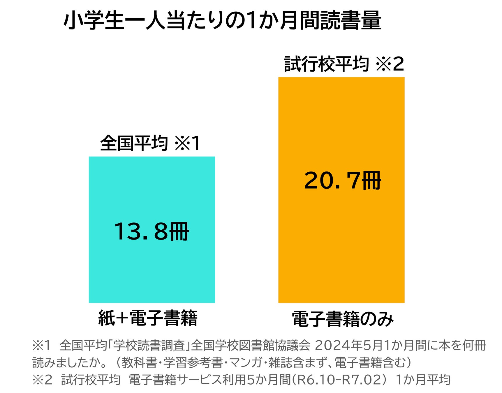 試行校では、試行期間の小学生一人当たりの電子書籍利用冊数が、1か月平均で約20.7冊でした。これは、紙の本と電子書籍を合わせた全国平均冊数13.8冊と比べても、約1.5倍の読書量です。『Yomokka!』により、貸出中のことがなく好きな本が読めたり、気軽にすきま時間を利用したり、多種多様な本を読めたりすることで得られた効果と考えられます。