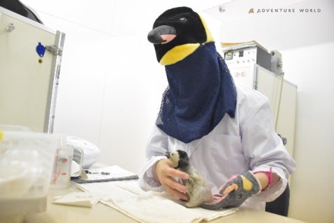 「生まれて初めて見た動くものを親と認識する」という鳥類の習性を利用し、スタッフがペンギン型の帽子を被り、ペンギンの嘴に見立てた手袋を装着します。声は一切発さずに録音した親鳥の鳴き声を聞かせながら 食事を与えます。