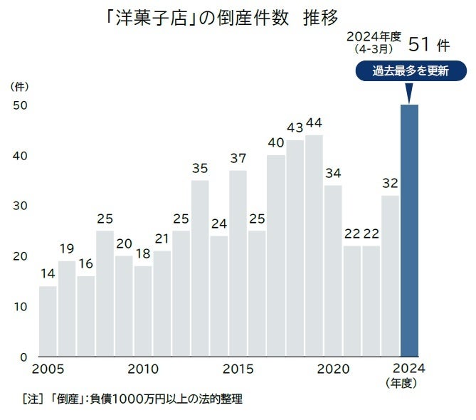 2024年度に発生した街の洋菓子店の倒産は51件発生し、前年度の1.6倍となり、過去最多を更新した。小麦粉、鶏卵、砂糖、バターといった原材料価格の上昇を、ケーキの販売価格に転嫁できず、利益が確保できない店舗が目立った。消費者の買い控えやコンビニスイーツとの競争など経営環境は厳しく、今後も倒産増加が続く可能性がある。