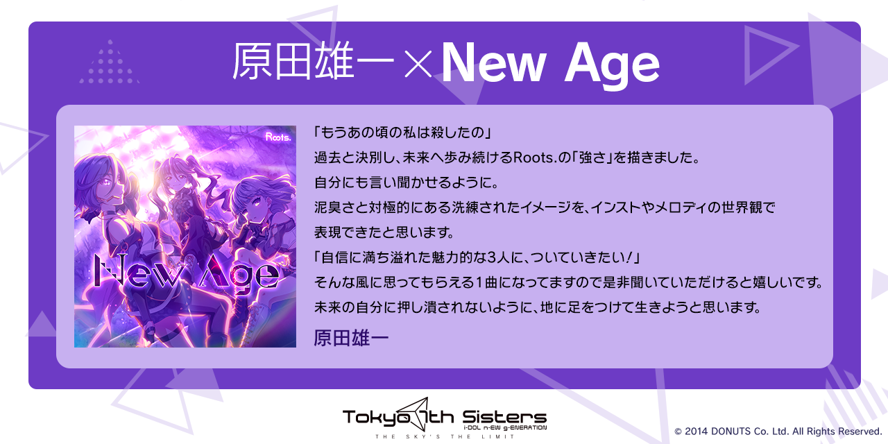 株式会社DONUTS(東京都渋谷区、代表取締役:西村啓成、以下:当社)が提供するスマートフォン向けゲームアプリ「Tokyo 7th シスターズ THE SKY’S THE LIMIT」は、月代ユウ(CV:天野聡美)、タン・シヨン(CV:橘一花)、フラナ・リン(CV:長谷川玲奈)による新ユニット「Roots.(ルーツ)」のデビューを決定いたしました。デビュー曲となる新曲「New Age」は、7月26日(火)18時よりゲーム内で先行リリースいたします。