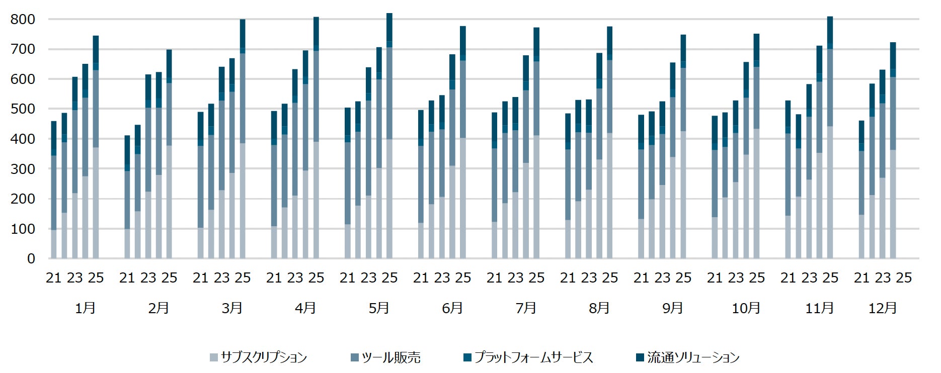 サブスクリプションは、CLIP STUDIO PAINT サブスクリプションモデルの売上です。ツール販売には、買い切りモデルや法人向けライセンスの売上などが含まれます。プラットフォームサービスには、CLIP STUDIO WEBサービスでの売上等が含まれます。流通ソリューションには、電子書籍及びDC3に関連する売上が含まれます。