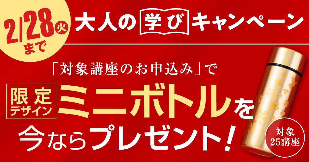 2022年12月28日、株式会社ユーキャンは『大人の学びキャンペーン』を開始しました。今なら対象講座の受講申込みをされた方全員に、もれなく素敵な「限定デザインミニボトル」を差し上げます。