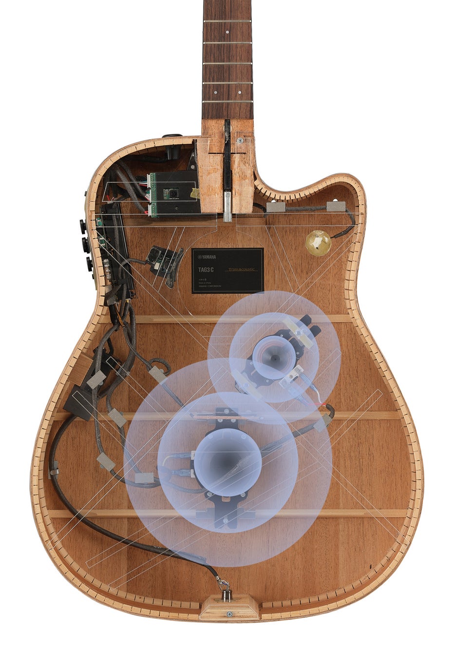 当社は、デジタル技術による機能を備えながら、発音はアコースティック楽器と同じ方式で行う独自技術「TransAcoustic™」を搭載した新しいアコースティックギターとして、「トランスアコースティックギター」を2016年に発売。2024年には第2世代モデル「TAG3 C」を発売しました。最大の特長は、弦などの振動を電気信号に変換してエフェクト処理し、ギター内部に搭載した「アクチュエーター」に伝え、ギターのボディを振動させることによって、アンプやスピーカーを使用せずにギター本体のみでエフェクトをかけた演奏が可能な点です。実音とエフェクト音が一体となってギター全体で響くことで自然で心地よい響きを得られ、今までにない演奏体験が好評を博しています。