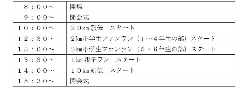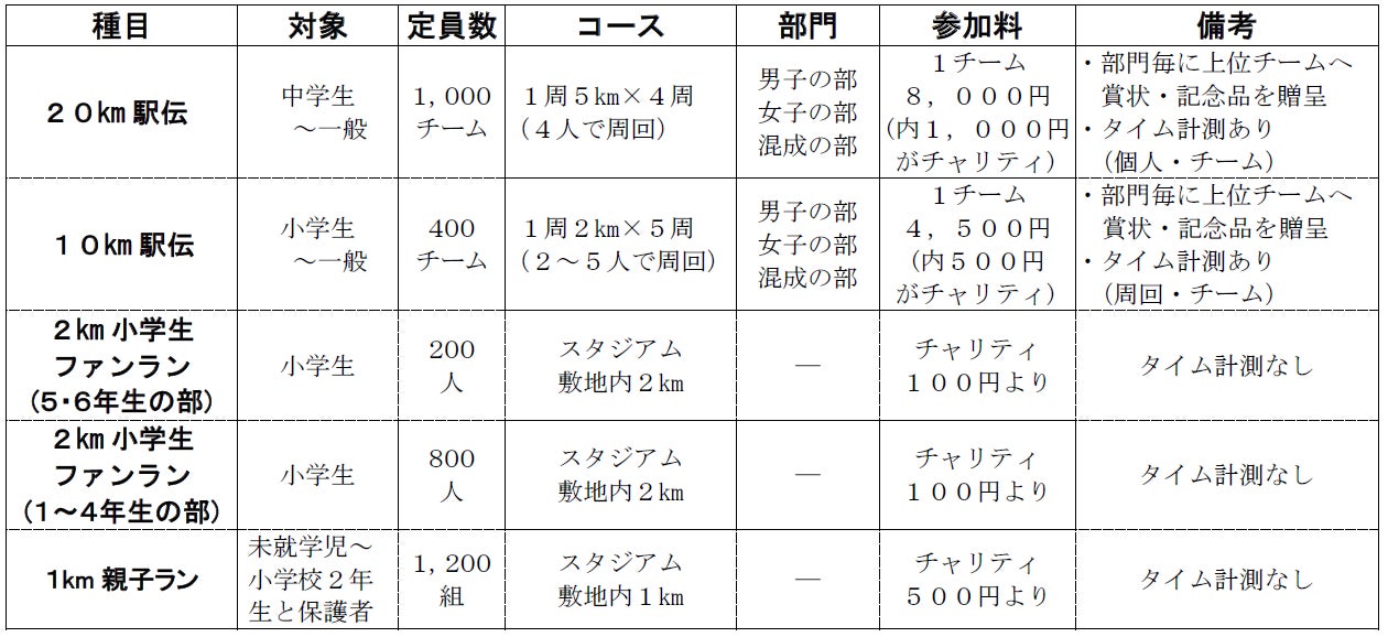 種目は、1チーム4人で競う「20㎞駅伝」、1チーム2~5人で競う「10㎞駅伝」、