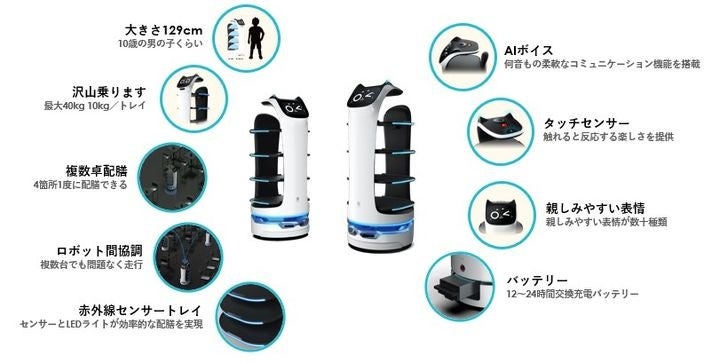 日本国内の様々な飲食店などで活躍中。メディアでも話題のネコ型配膳ロボット。人材不足の解消や店舗運営のスマート化(コスト削減)、 回転率向上(UP)などにて活躍。