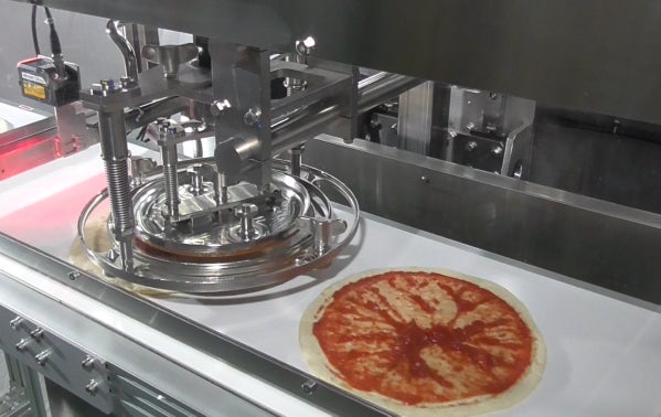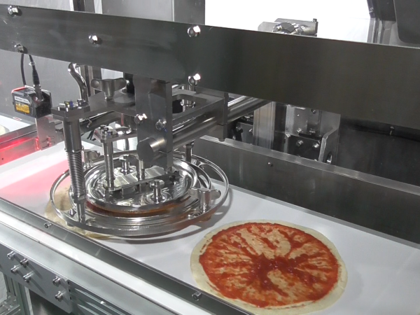 ピザ製造工程において、ソースを均一に塗り広げる作業は人の手作業で行われている店が大半。本装置では人の手でソースを均一に塗る作業の自動化を実現。ピザの直径違いや、塗り方の調整は専用パットの交換のみで対応可能。