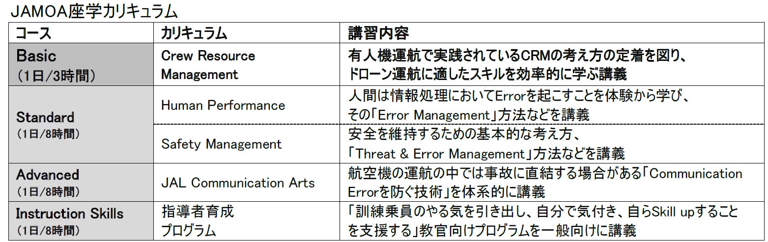 こうしたドローン運航を取り巻く環境変化を踏まえ、JAMOAは、「CRM概念と必要なスキル」を効率的に学べる「Basic」コースを新設のうえ、より広く、ドローンに携わる方々に受講いただきやすいカリキュラム/価格にて応募を開始します。