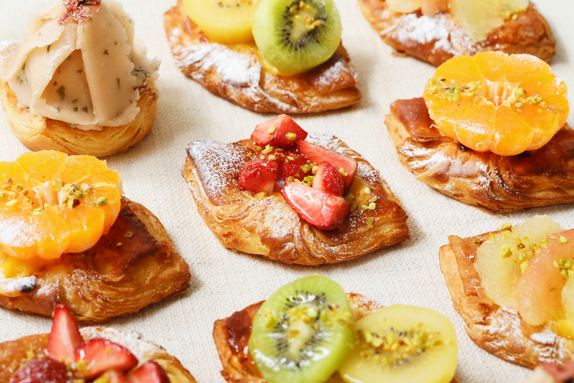 フレッシュな苺を使用した『デニッシュ~イチゴ~』をはじめ、柑橘の爽やかな酸味が絶妙な『デニッシュ~ミカン~』、2種類のグレープフルーツのコントラストが美しい『デニッシュ~グレープフルーツ~』、自家製の桜クリームを華やかに絞った『デニッシュ~桜のモンブラン~』、キウイ本来の味わいをお楽しみいただける『デニッシュ~キウイ~』をご用意。
