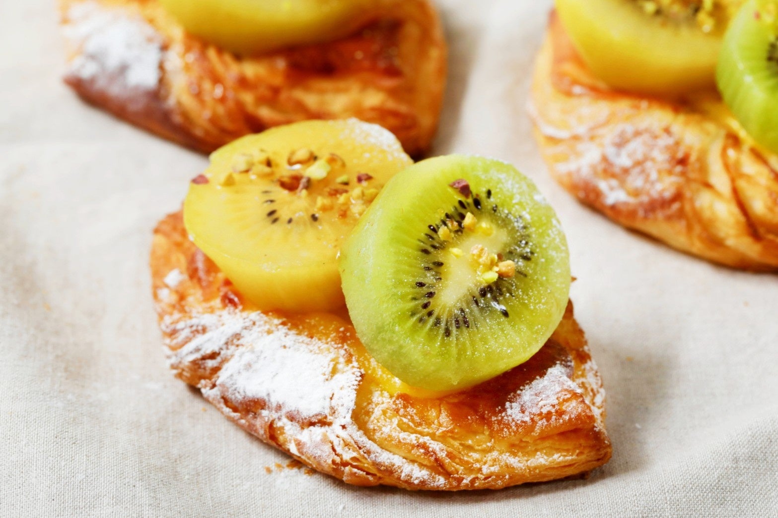 デニッシュ生地に、カスタードクリームを絞り、2種類のキウイを盛り付けて仕上げまし