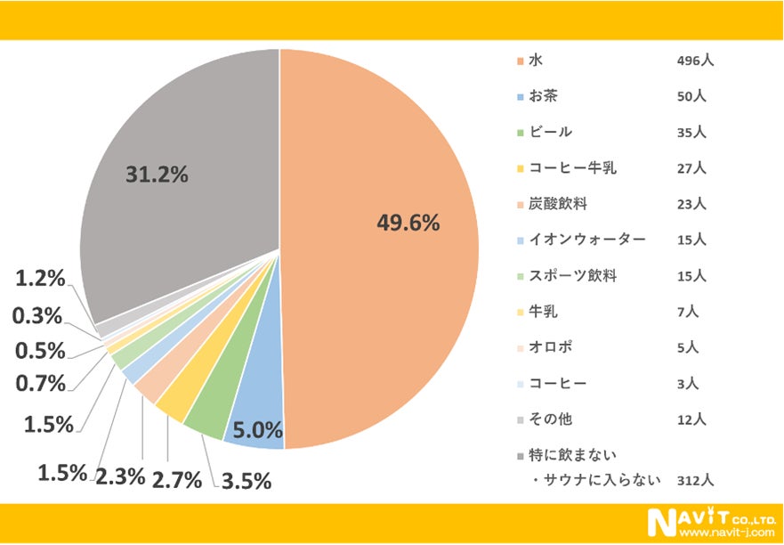 やはり「水」を飲むという方が49.6%と約半数になっています。身体をカラカラにした後の水は凄く美味しいものです。続いて「お茶」が5.0%です。そして、やはり外せないでしょう。「ビール」が3.5%となっています。
