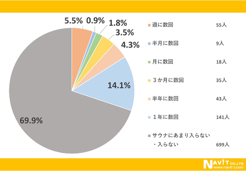 サウナに入るのは「1年に数回」という方が14.1%で一番最多でした。続いて「週に数回」という方が5.5%、「3ヶ月に数回」という方が3.5%となっています。