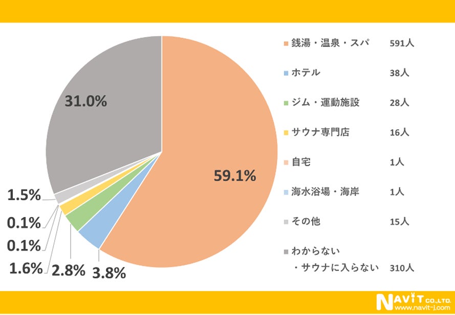 「銭湯・温泉・スパ」でサウナに入るという方が59.1%いらっしゃいます。定番の入浴場所です。続いて「ホテル」でサウナに入る方が3.8%とな