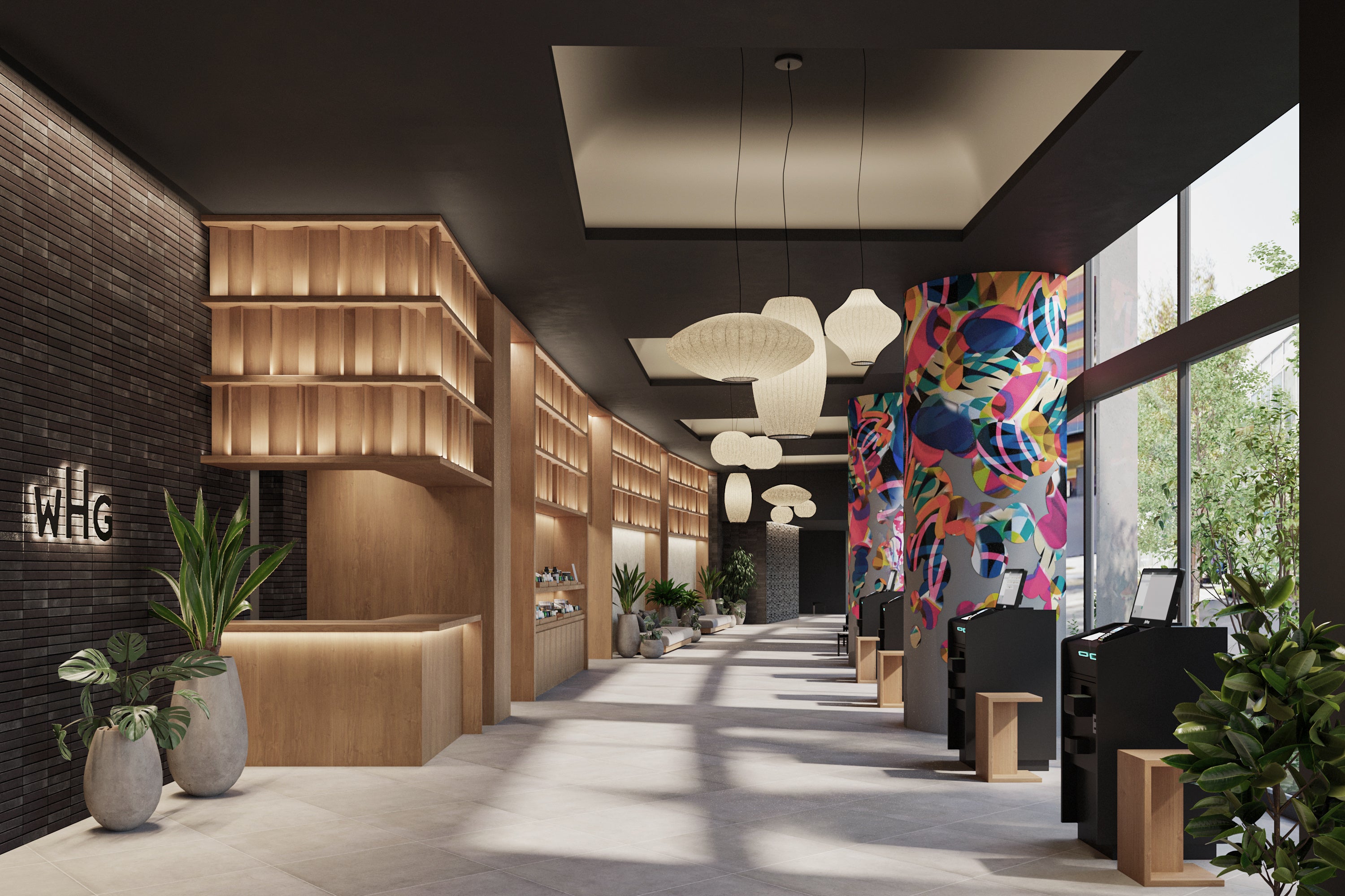 中洲屋台の温もりを感じさせる木質素材などを配し、地元の賑わいを演出する空間でお出迎えいたします。