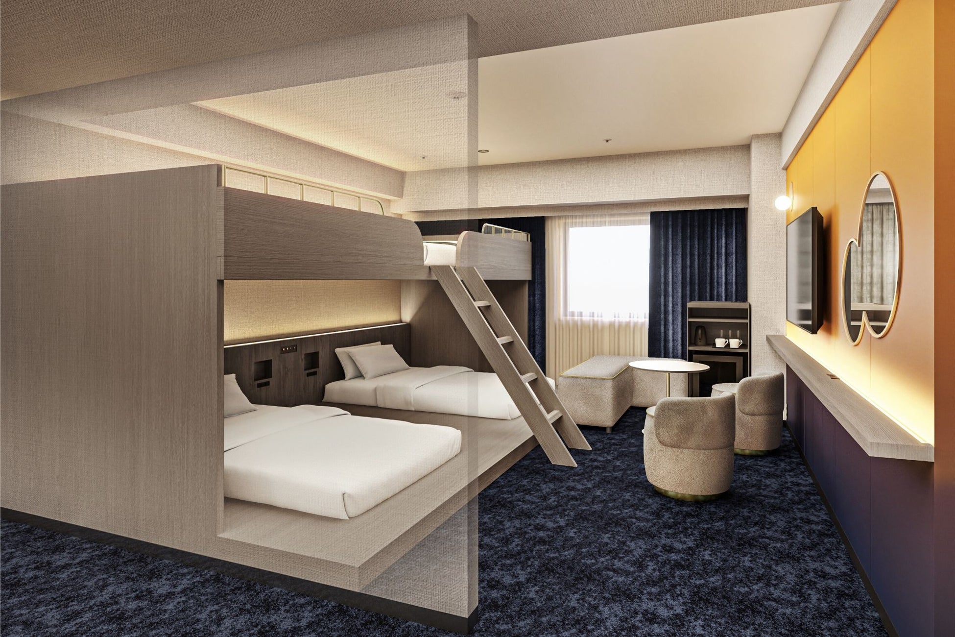 2段ベッドを備えた遊び心ある4名さま向け客室。お子さま連れのご家族やグループ旅行に最適です。空間を効率よく活かした開放感ある設計で、楽しく快適にお過ごしいただけます。