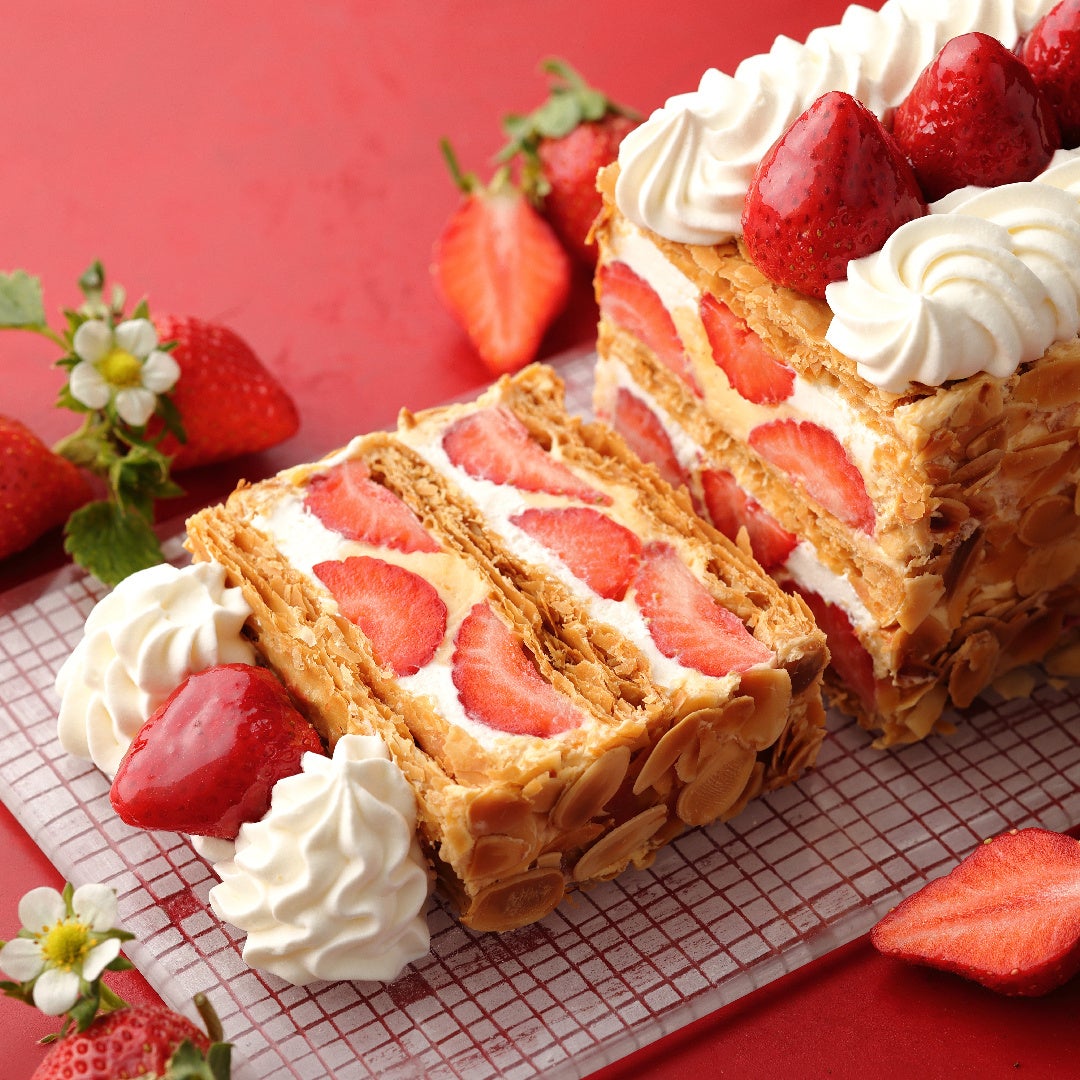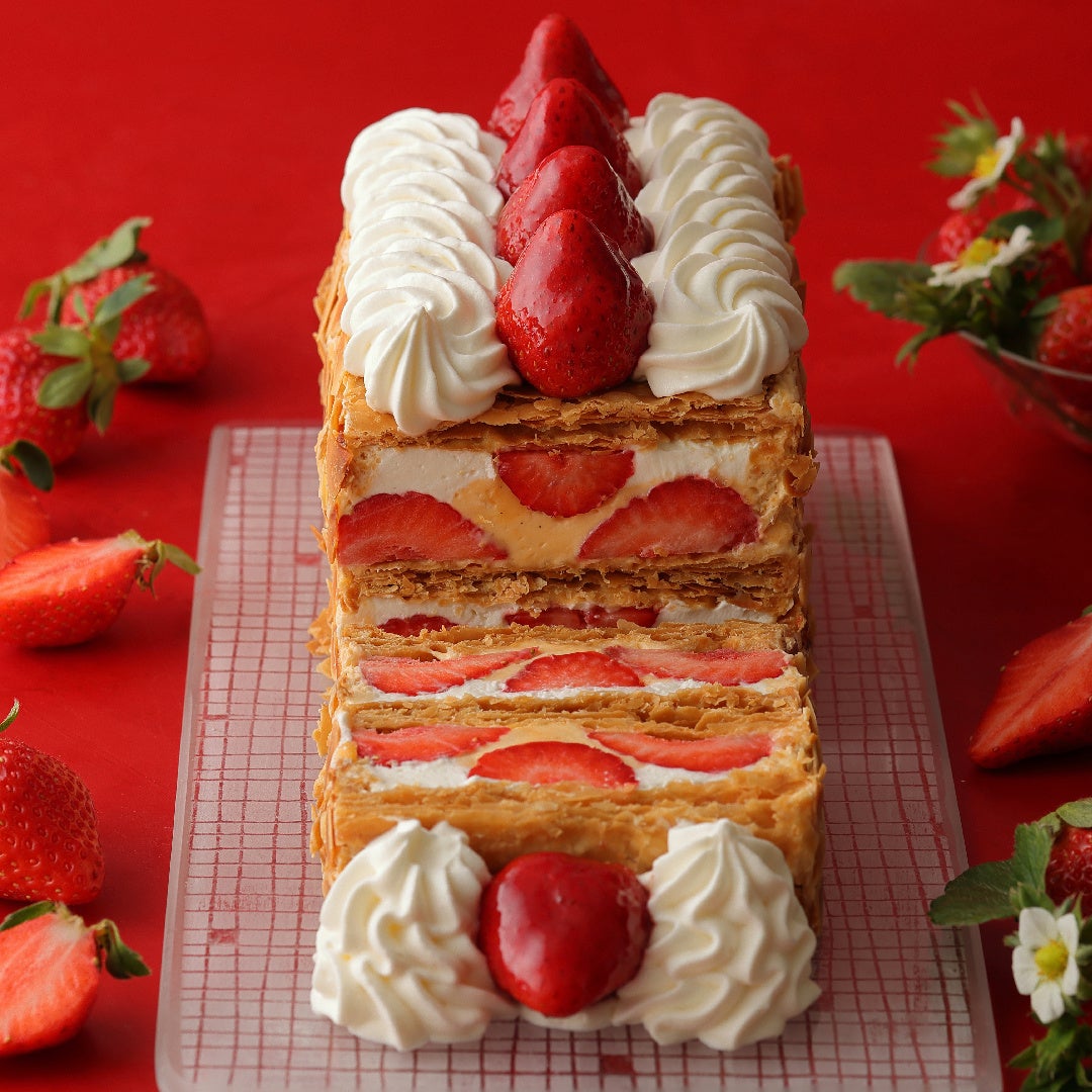 サクサクのパイ生地で、苺とクレーム・シャンティ、ディプロマットクリームを重ね合わせることで生まれる酸味と甘み、パイ生地の食感による絶妙なバランスが特徴です。
