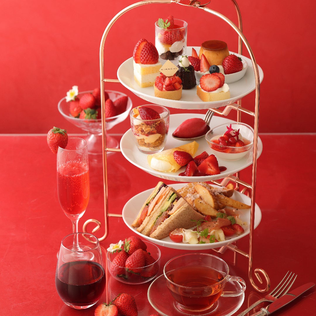 いちごシーズン第2弾のアフタヌーンティーは、甘くみずみずしい真っ赤な苺「あまおう」が主役。パフェ、タルト、ショートケーキ、こだわり卵のプリン・ア・ラ・モードなど、あまおう苺を盛り込んだキハチ自慢のスイーツが勢揃いし、セイボリー3種とともにお楽しみいただけます。