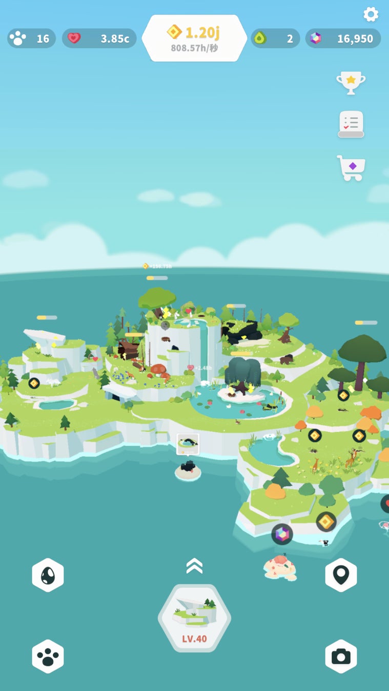 レベルが成長するたびに、静かな森、湖、海辺など、地形を拡張させて綺麗な自然風景を育てていくことができます。なお、キツネ、鹿、熊など様々な自然の中で動物たちを収集する楽しさもあります。