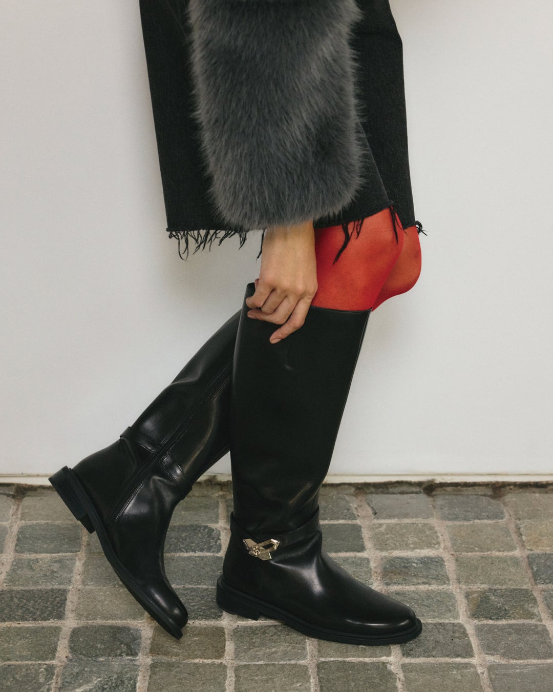 エレガントさとモードさを兼ね備えた雰囲気のロングブーツは、アンクルベルトがアクセントになる一足。