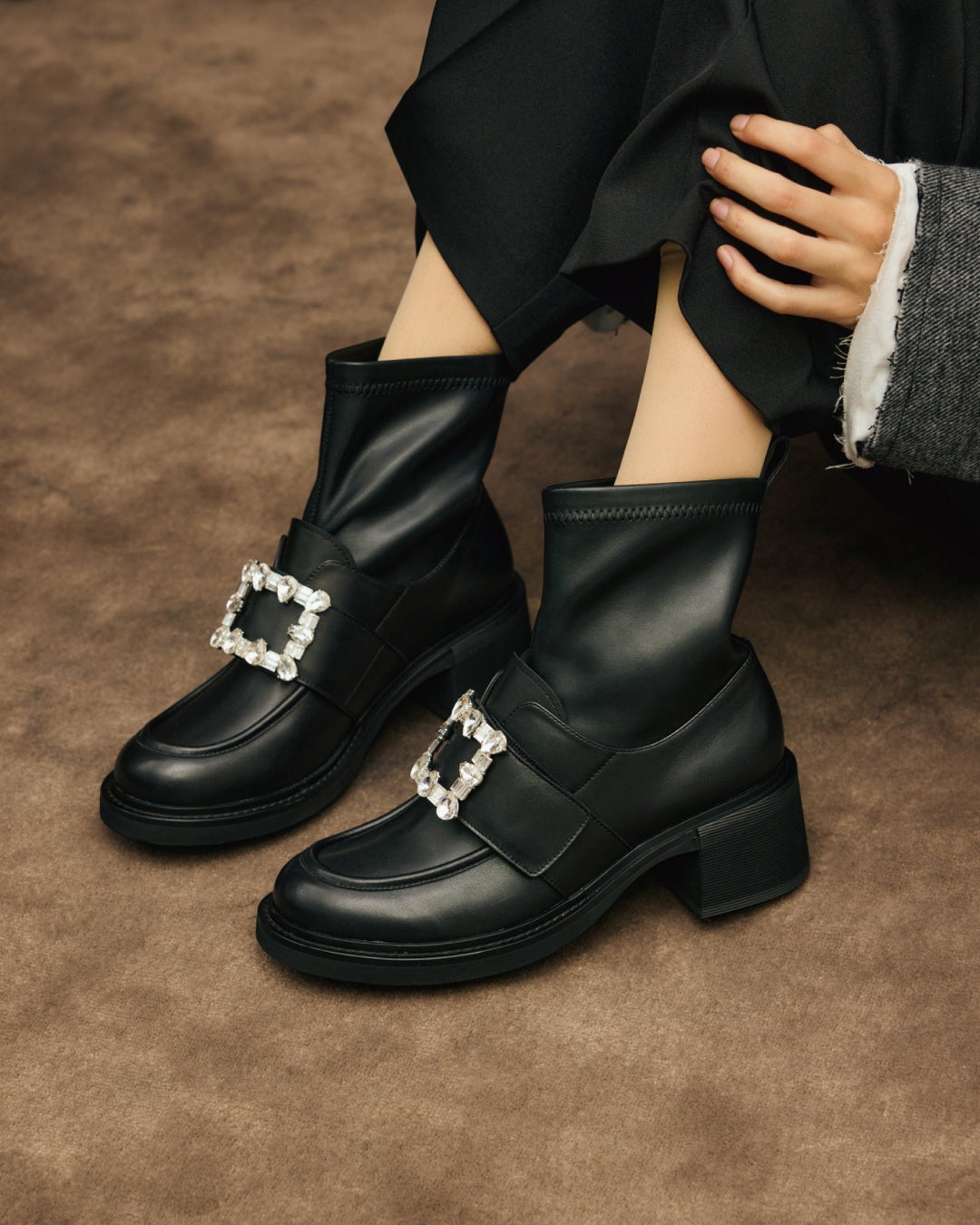 フロントに輝くビジューバックルが、足元を主役級にしてくれるストレッチコンビブーツ。