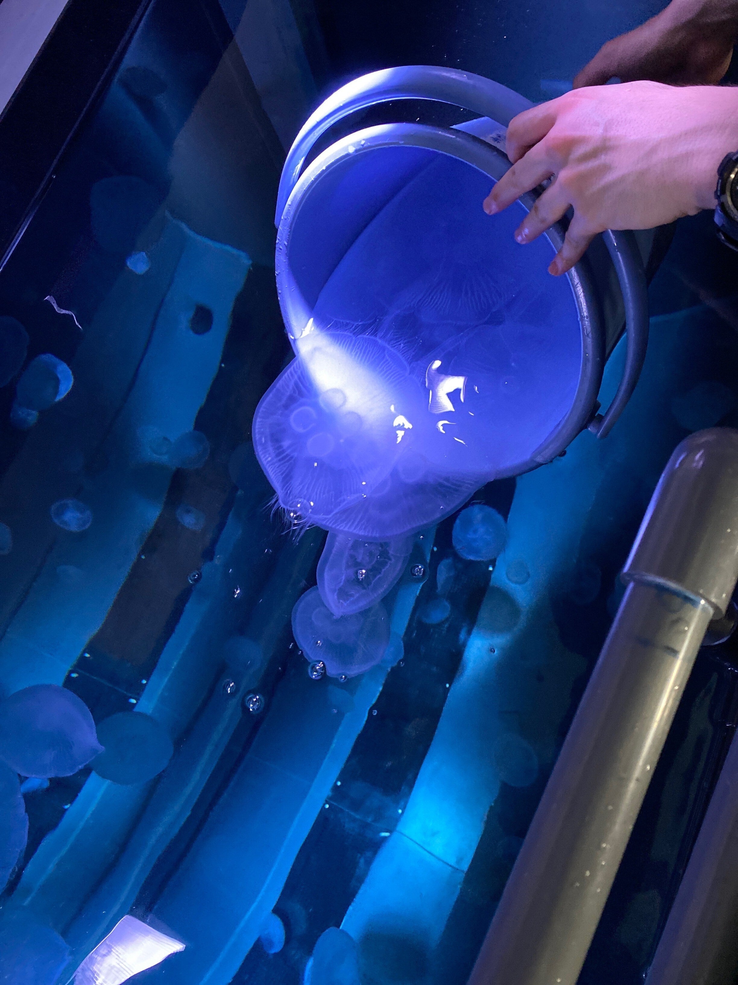 大事に育て上げたミズクラゲたちは、学生自身の手によって搬入され、クラゲ水槽として日本最大級の横幅を誇る、サンシャイン水族館「海月空感(くらげくうかん)」内の「クラゲパノラマ」水槽に展示されます。