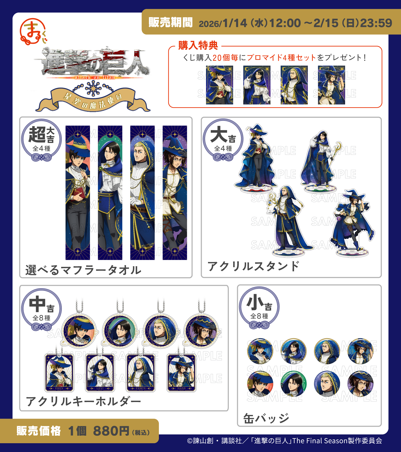 星空×魔法使いをイメージした衣装に身を包んだ「エレン」、「リヴァイ」、「エルヴィン」、「ハンジ」の新規描き下ろしイラストを使用した商品をご用意いたしました。