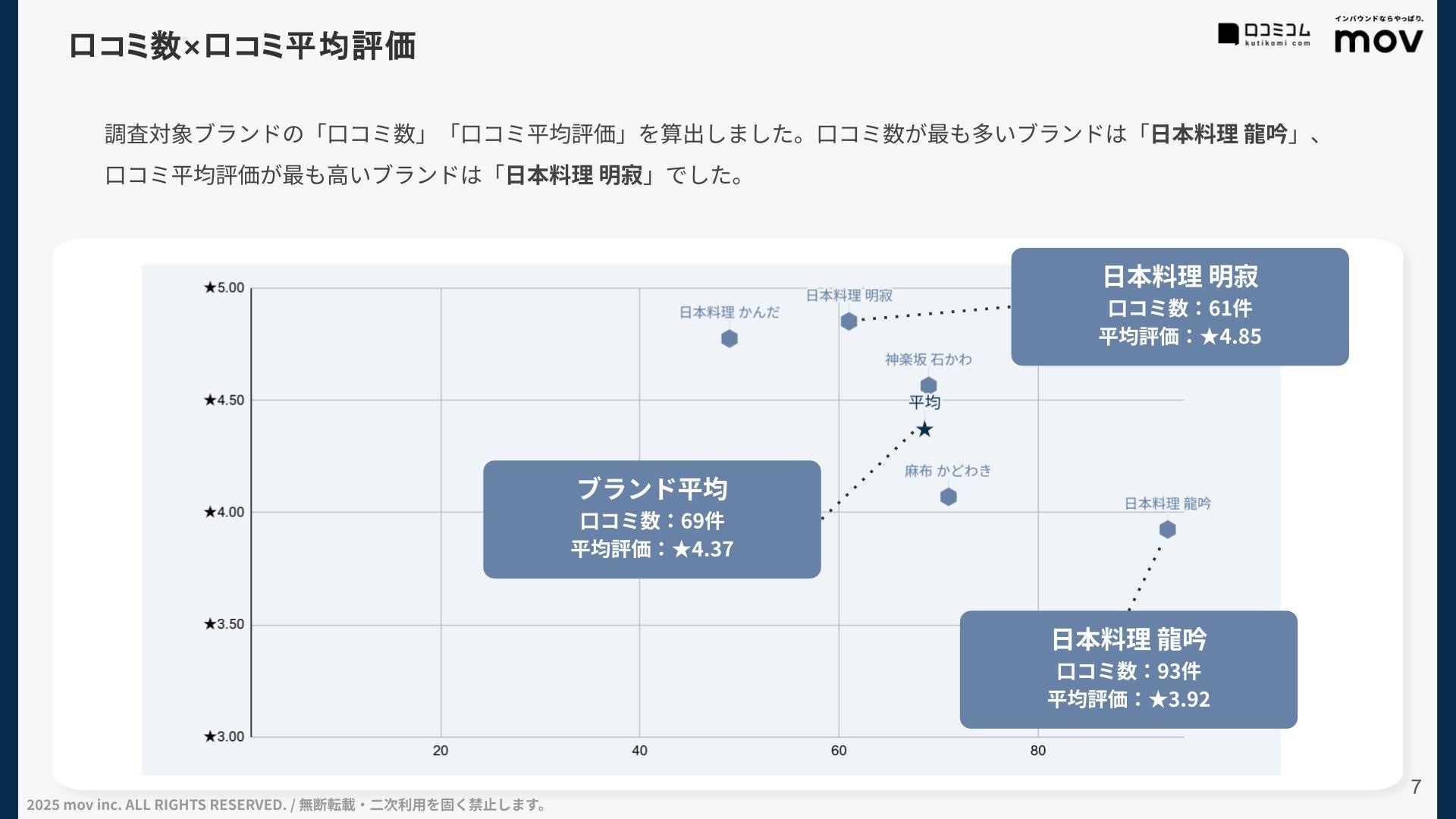 調査対象ブランドの「口コミ数」「口コミ平均評価」を算出しました。口コミ数が最も多いブランドは「日本料理 龍吟」、口コミ平均評価が最も高いブランドは「日本料理 明寂」でした。
