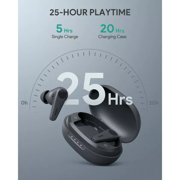【25H再生時間】1回充電で最大5時間の再生時間ができ、また付属の充電ケースを合わせて使えば、最大25時間の連続使用が可能。充電ケースにはUSB-C充電ポートを搭載し、普通のMicroポートより急速充電できます。