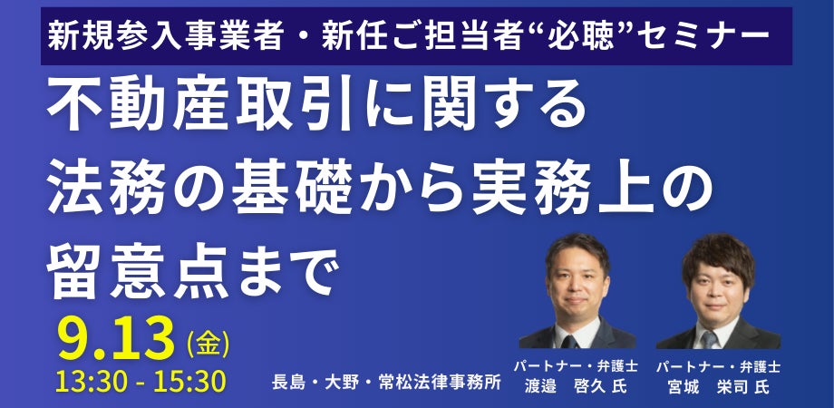 JPI(日本計画研究所)は、長島・大野・常松法律事務所 パートナー・弁護士 渡邉 啓久 氏、パートナー・弁護士 宮城 栄司 氏を招聘し、不動産取引に関する法務の基礎から実務上の留意点について詳説いただくセミナーを開催します。