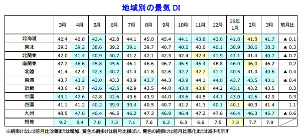 『東海』『北関東』など6地域が悪化、『四国』など4地域が改善した。都道府県別は22道府県が悪化、23府県が改善。関税の引き上げや利上げ前の駆け込み受注がみられたが、低調な公共工事は地域経済の景況感を下押しした。