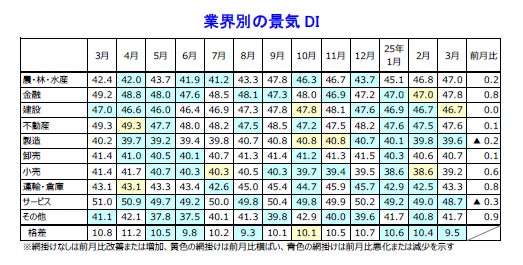 2025年3月の景気DIは前月から横ばいの43.5となった。国内景気は、人出の増加が下支えしたが、食品や原材料の価格の高止まりが抑制要因となった。今後の景気は、IT関連の設備投資などが支えるものの、世界経済の不確実性が高まり、横ばい傾向が続くと見込まれる。
