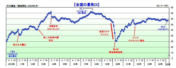 2025年3月の景気DIは前月から横ばいの43.5となった。国内景気は、人出の増加が下支えしたが、食品や原材料の価格の高止まりが抑制要因となった。