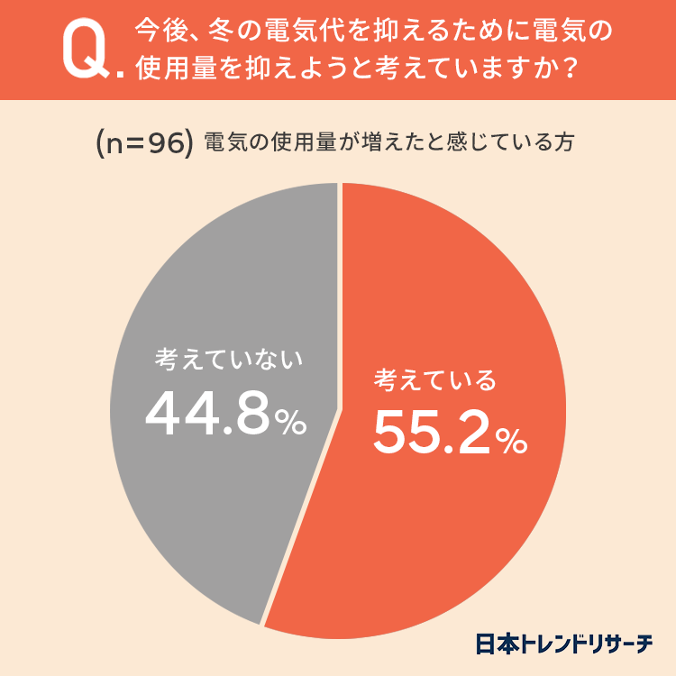 55.2%の方が、今後、電気代を抑えるために電気の使用量を抑えようと「考えている」と回答しています。
