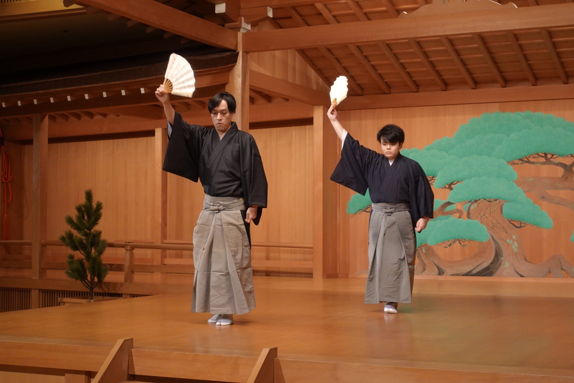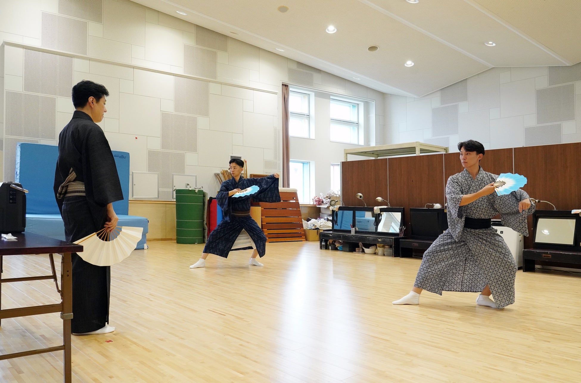 能の主役(シテ)の相手役を演じる「ワキ方」、能楽の音楽である囃子をつとめる「囃子方」、狂言を演じる「狂言方」という三つの役方(能楽三役)の研修を行っています。