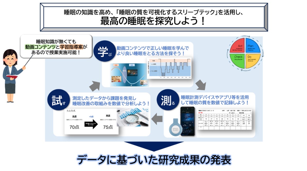 そのような背景から、昨年度のスリープテックプロジェクトの内容を、他学年や他教育機関・自治体へも展開できるような汎用的なモデル授業とすることをめざした設計とし、教育現場における「睡眠×テクノロジー」の有効性を確かめ、展開可能なモデル授業を確立してまいります。