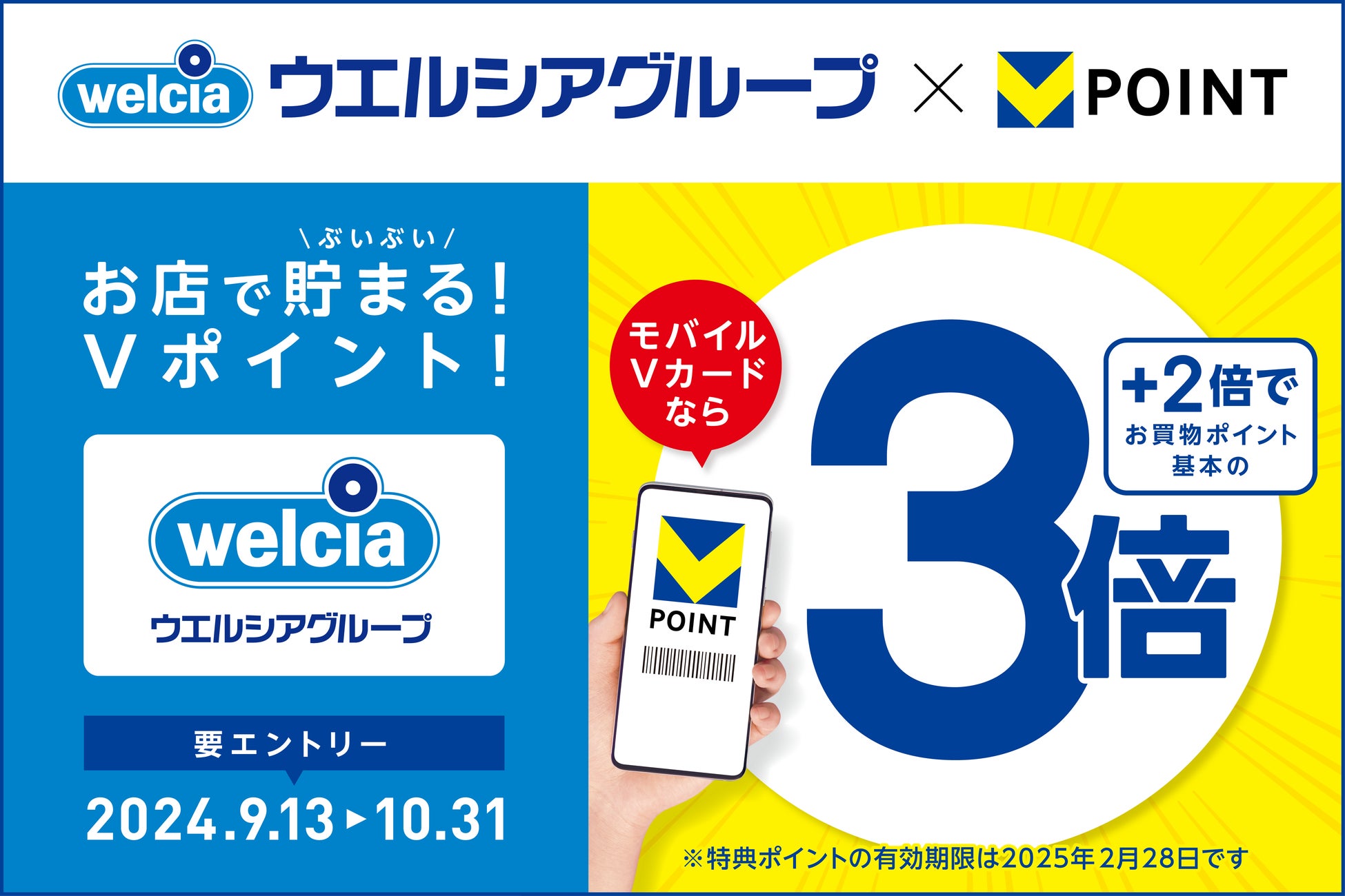 ウエルシア薬局株式会社(本社:東京都千代田区、代表取締役社長:田中純一、以下「ウエルシア薬局」)と、CCCMKホールディングス株式会社(本社:東京都渋谷区、代表取締役社長 兼 CEO:髙橋誉則、以下「CCCMKHD」)は、2024年9月13日(金)~10月31日(木)まで、ウエルシアグループ店舗のお買い物で「モバイルVカード」をご提示いただくと、Vポイントが3倍になるキャンペーンを開催いたします。