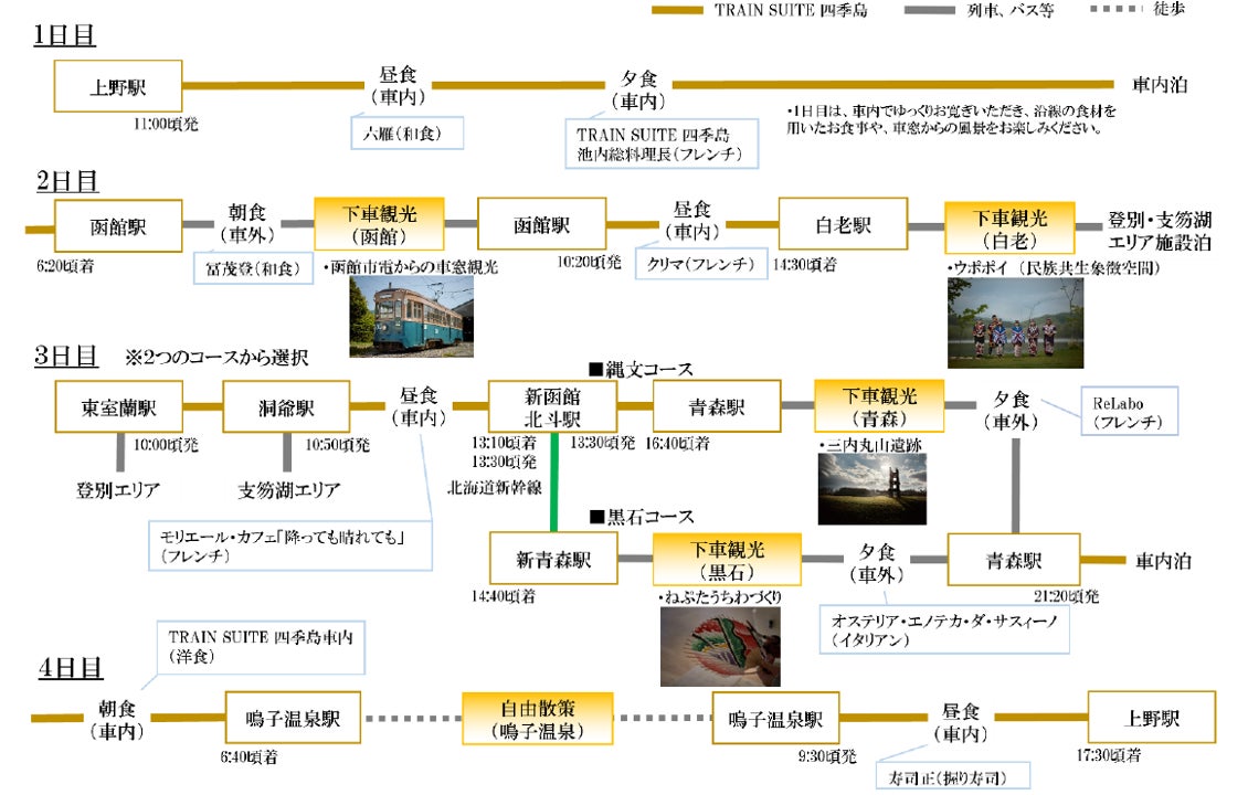 「3泊4日コース/秋」は、「大自然の織りなす風景と、受け継がれてきた悠久の文化にふれる旅。」をテーマに、上野駅を出発し、北海道の函館・道南、そして本州に戻り、東北の文化に触れます。
